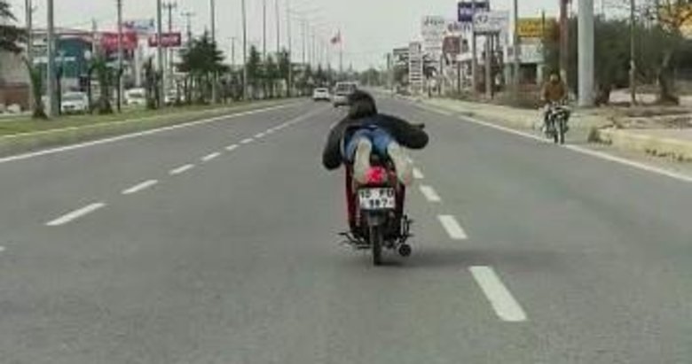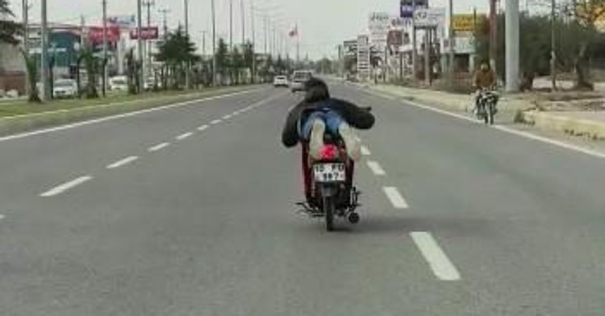 Balıkesir'in Edremit ilçesinde bir motosiklet sürücüsünün seyir halinde motorunun üzerine yatarak yol alması kameralara yansıdı. Sosyal medyada paylaşılan görüntüler büyük tepki çekti.