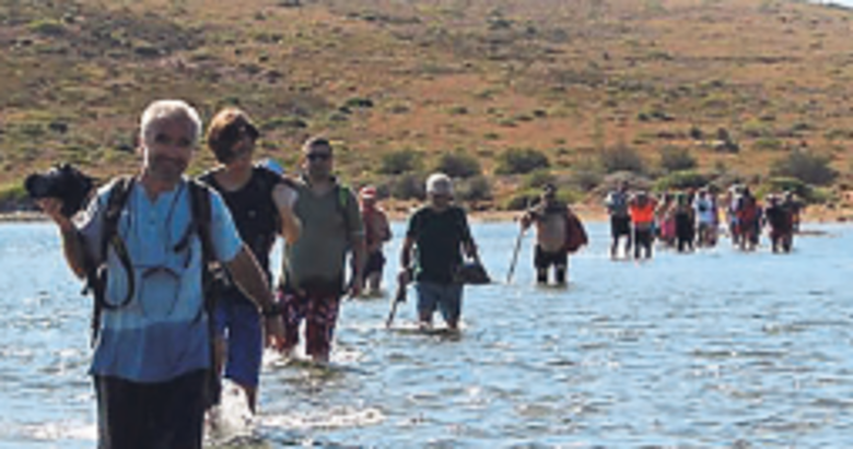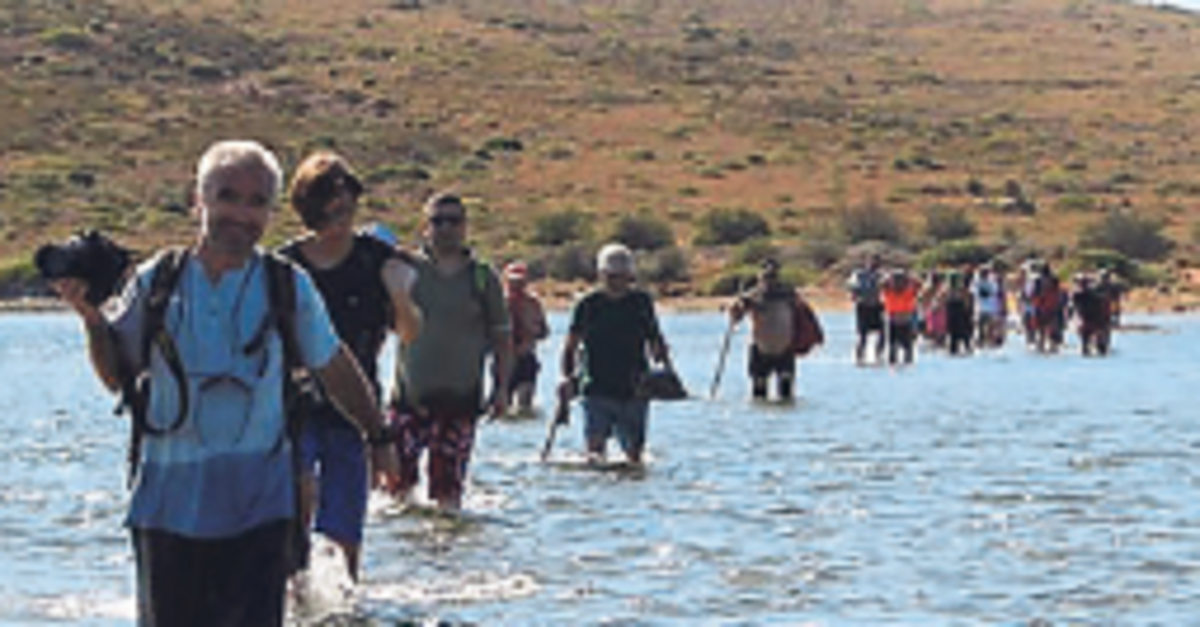 BALIKESİR Ayvalık'ta çıktıkları doğa yürüyüşü sırasında denizin ortasındaki sığ bölgeden Maden Adası'na geçen ekip, su seviyesinin yükselmesi nedeniyle bölgede mahsur kaldı.