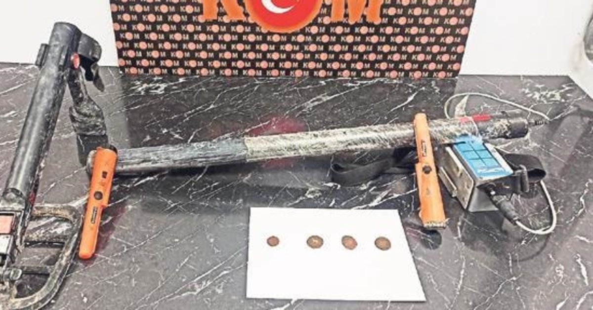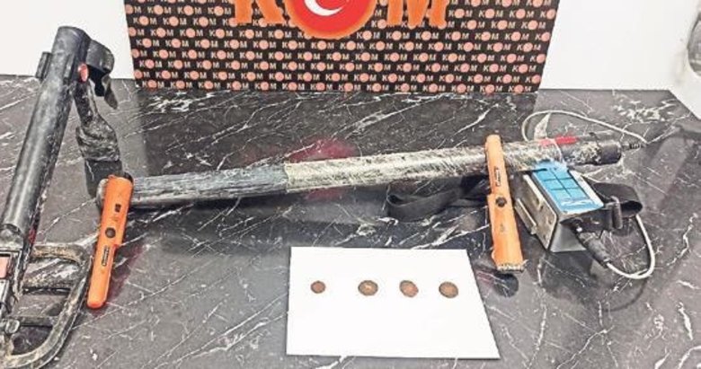 KÜTAHYA'DA Asayiş Şube Müdürlüğü Motosikletli Polis Timleri tarafından Meydan Mahallesi Osmanlı Caddesi'nde Genel Asayiş tedbirleri çerçevesinde devriye görevi sırasında bir araç durduruldu. Araçta M. Ö. isimli şahsın yapılan üst aramasında, tarihi eser olduğu değerlendirilen 4 sikke, 3 el detektörü ele geçirildi. Şşahsın ikametinde yapılan aramada, 1 el dedektörü ele geçirildi. Şahıs hakkında tahkikat başlatıldı.