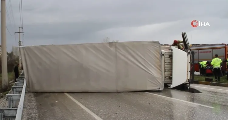Manisa'nın Kula ilçesinde, yağmur nedeniyle kayganlaşan yolda kontrolden çıkan bir kamyonet devrildi.