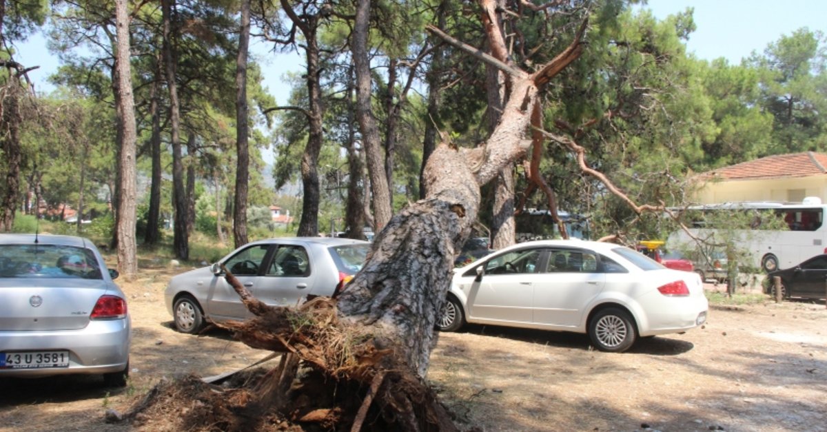 Günübirlik tatilcilerin adeta akın ettiği Ula'nın Akyaka Mahallesinde çok sayıda aracın park halinde olduğu bir alanda kökleri kuruyan ağaç faciaya neden oluyordu.