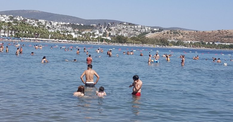 Kentte hava sıcaklığı 33 dereceyi gösterirken nem oranı yüzde 69 olarak ölçüldü. Deniz suyu sıcaklığının 30 derece olduğu ilçede dünyaca ünlü Gümbet, Ortakent ve Bitez Plajı'na gelen tatilciler, denize girerek serinledi. Koronavirüs tedbirleri kapsamında 2 metre aralıklarla konulan şemsiyeler altında güneşlenen tatilciler, keyif yaptı.