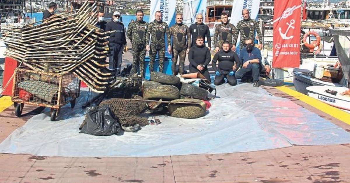 MUĞLA'NIN Bodrum ilçesinde yapılan deniz dibi temizliğinde deniz altından çıkan çöpler görenleri şaşkına çevirdi. Deniz dibinden en çok şezlong ve otomobil lastiği çıktı. Bodrum Belediyesi ve Muğla Büyükşehir belediyesi iş birliği ile Gümbet limanında deniz dibi temizliği yapıldı. 10 dalgıç Gümbet limanından denize daldı. Özellikle teknelerin bulunduğu noktalarda temizlik yapan dalgıçlar gördükleri manzara karşısında şok oldu. Lastikten, marangoz malzemelerine, pet şişeden cam şişeye birçok atık malzeme çıktı. Yaklaşık 1 ton çöp ve atık malzeme çıkarılan deniz dibinden 20 adet şezlong çıkarıldı.