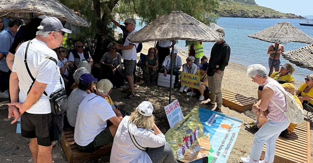 Özgür Kıyılar Bodrum İnisiyatifi ve Gümüşlük Forumu ile bir grup, Gümüşlük Mahallesi'ndeki halk plajına bir işletme tarafından önceki gün şezlong konularak hukuksuz yere işgal edildiği gerekçesiyle bir araya geldi.