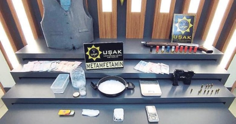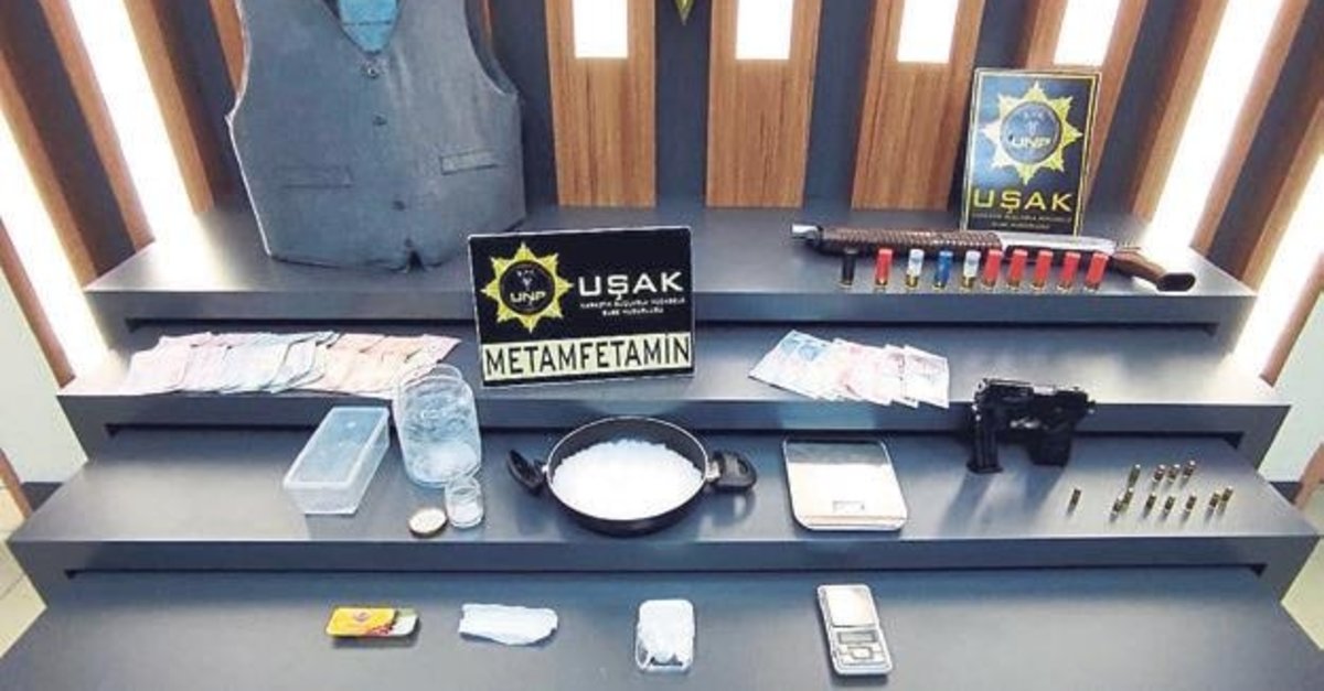 UŞAK'TA zehir tacirlerine yönelik düzenlenen operasyonda, ruhsatsız silahlar, çelik yelek ve uyuşturucu madde ele geçirildi. Merkez ilçede yapılan operasyonlarda 5 şahıstan toplam 365 gram metamfetamin, 1 adet ruhsatsız tabanca, 11 adet tabanca fişeği, 1 adet ruhsatsız tüfek, 2 adet hassas terazi, 1 adet çelik yelek ve çeşitli suçlardan elde edildiği değerlendirilen 7130 TL para ele geçirildi. Yakalanan 5 şüpheli şahıs hakkında "Uyuşturucu Madde Ticareti" suçundan yasal işlem başlatıldı.
