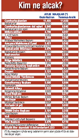 Genelkurmay Başkanı'nın emekli maaşı ek ödemeyle birlikte 5 bin 680 liradan 5 bin 884 liraya, Anayasa Mahkemesi Başkanı'nın ise 3 bin 976 lira olan emekli maaşı 4 bin 119 liraya yükseldi. Yeni katsayılarla Danıştay, Yargıtay ve Sayıştay başkanları, Yargıtay Cumhuriyet Başsavcısı ve YÖK Başkanı'nın maaşı da 4 bin 119 lira oldu. Genel müdürlerin yeni maaşı 3 bin 278 lira, profesörlerin de 3 bin 92 lira olarak belirlendi. Vali ve TBMM'deki bir Daire Başkanı'nın maaşı 3 bin 305 liraya, diğer daire başkanlarının maaşı da bin 771 liraya çıktı.