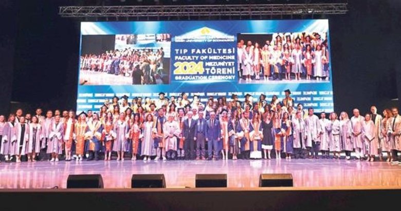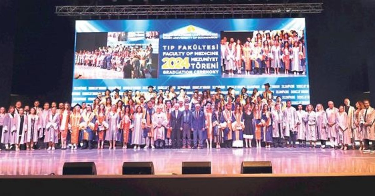 İZMİR Ekonomi Üniversitesi (İEÜ) Tıp Fakültesindeki eğitimlerini başarıyla tamamlayan 59 genç hekim, diplomalarına kavuştu. Beyaz önlüklerini giyerek başladıkları 6 yıllık eğitim yolculuğunu gurur ve mutlulukla bitiren hekimler, keplerini havaya fırlatarak mezuniyet coşkusunu doyasıya yaşadı. 'Hekimlik Andı'nı hep birlikte okuyan gençler, konuklardan büyük alkış aldı. İzmir Ekonomi Üniversitesinin kampüsünde bulunan amfitiyatroda düzenlenen 2023- 2024 Akademik Yılı Tıp Fakültesi Mezuniyet Töreni'ne; Rektör Prof. Dr. Yusuf Hakan Abacıoğlu, İzmir Ticaret Odası Meclis Başkanı Selami Özpoyraz ve Meclis Başkan Yardımcısı Mehmet Tahir Özdemir, Medical Point Hastaneler Grubu Yönetim Kurulu Başkan Vekili Veysi Kubba, İzmir Tabip Odası Başkanı Prof. Dr. Mehmet Ceyhun Özyurt, Tıp Fakültesi Dekanı Prof. Dr. İlgi Şemin, İEÜ Medical Point Hastanesi Başhekim Yardımcısı Doç. Dr. Önder Limon, mütevelli heyet üyeleri ve davetliler katıldı.