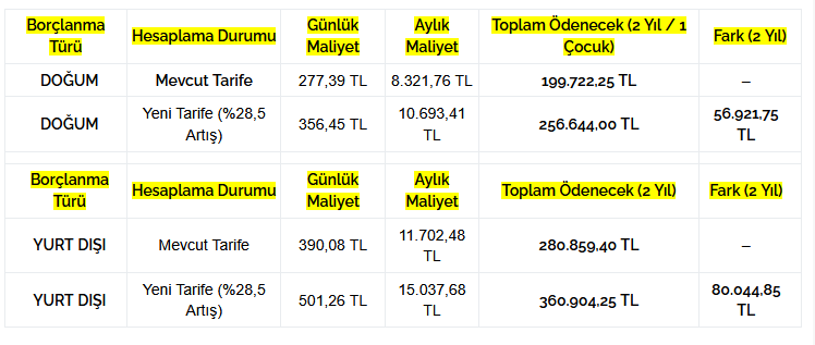 Bu tabloda, özellikle kadın çalışanları ilgilendiren Doğum Borçlanması ve yurt dışındaki süreleri değerlendirmek isteyenler için Yurt Dışı Borçlanmasındaki yeni maliyetler ve fiyat farkları yer almaktadır.