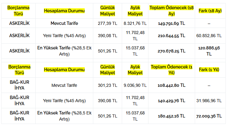 Bu tabloda, Askerlik Borçlanması ve Bağ-Kur İhya Borçlanması için mevcut ve olası zamlı tarifeler arasındaki karşılaştırmalı farklar gösterilmektedir.