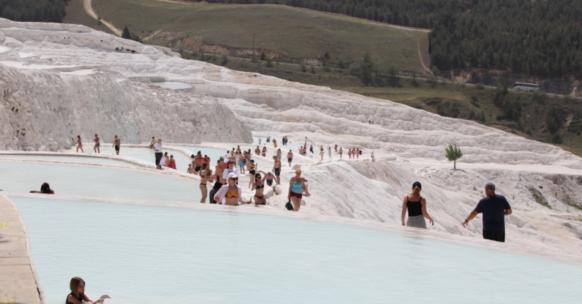 Travertenleri, antik kenti ve şifalı sularıyla dünyaca ünlü, "Beyaz Cennet" olarak adlandırılan Pamukkale, pandemi kapsamında alınan tedbirler nedeniyle turistlere kaldı. Bölgede etkili olan güneşli havayı fırsat bilen turistler travertenlerde gezip, güneşlendi. Turistler, antik havuza girmeyi de ihmal etmedi.