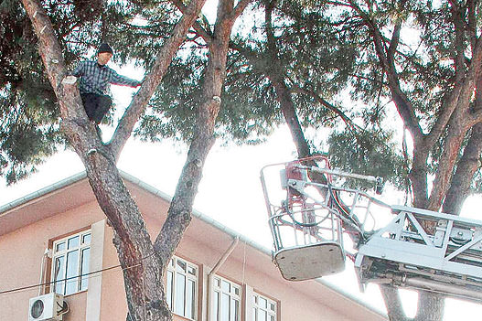 Bu arada okul müdürü İsrafil Kılıçkara, gürültüleri duyunca bahçeye çıktı ve ne olduğunu anlamaya çalışırken ekiplerin gelmesiyle şaşkına döndü. Okul bahçesinde öğrencilerin üzerine düşerek tehlike saçan çam kozalaklarını bir hafta önce toplatmak için Şerafettin Acar'ı çağırdığını anlatan Kılıçkara, "Maddi durumu iyi olmayan Şerafettin Acar, çam fıstıklarını satarak ekmek parasını çıkarsın diye söylemiştim. Bugün geleceğini bana da söylemedi. Öğrencilerimin yanlış anlaması sonucunda böyle bir durum ortaya çıktı. Çok şaşkınım" dedi. İtfaiye yardımıyla 10 metre yüksekliğindeki çam ağacından indirilen Şerafettin Acar, bir süre sonra da serbest bırakıldı. Acar, "Kalan kozalakları toplayacağım" dedi. ALİ SOYDEMİR