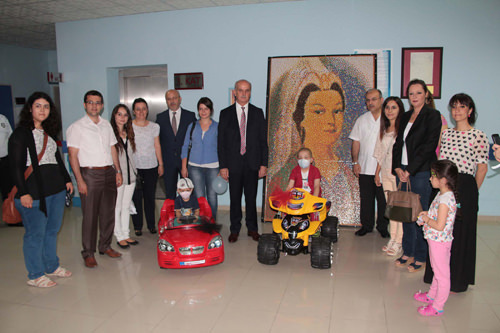 CBÜ Rektörü Prof. Dr. Kemal Çelebi, Rektör Yardımcısı Bilal-i Habeş Gümüş, projenin koordinatörü Mühendislik Fakültesi Endüstri Mühendisliği Bölümü Öğretim Üyesi Rahime Sancar Ediz ile projeyi yürüten üniversite hediyeleri teslim etti. Rektör Prof. Dr. Çelebi, "Bu çalışma ile öğrencilerimiz hem anlamlı bir iş yaptılar, hem de 30 bin raptiyeden oluşan 3 metrelik Hafsa Sultan portesi ile Guinness Rekorlar Kitabı'na aday oldular. Tablodan elde edilen 15 bin 700 liralık gelir ile hastanemiz bünyesindeki Onkoloji Servisi'nde yatan 15 çocuğumuz hayallerini gerçeğe dönüştürmek istedi. Ancak öğrendik ki 3 çocuğumuz bu hayallerindeki oyuncağı göremedi. Bu bizim için üzüntü verici bir durum. Tedavisi süren ve yaşları 2 aylık ile 17 yaş arasında değişen çocuk ile gençlerimizin hayalleri gerçek oldu. Bu çocuklarımızı sevindirmek ve hayata yeniden bağlamak gerçekten çok önemli. Bu hediyeler ile onların hayata yeniden bir umutla baktığına inanıyorum" diye konuştu. Konuşmanın ardından Rektör Prof.Dr. Çelebi, Onkoloji Servisi'nde yatan çocuk ve gençlerin hayal ettikleri hediyeleri tek tek verdi. Proje çerçevesinde elde edilen gelir ile 3 akülü araba, 1 genç odası, 1 bebek odası, 1 beşik, 2 tablet, 3 cep telefonu, 1 fotoğraf makinesi alınırken, geriye kalan parayla servisin çocuk oyun odasına çeşitli oyuncaklar alındı.