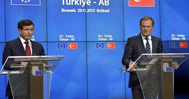 Türkiye'nin etrafındaki politik problemlere, gerilimlere ve özellikle Suriye'den AB bölgesine gelen yasadışı göçe ilişkin olarak, "ortak bir eylem planında" anlaşmaya varıldığını belirten Davutoğlu, "Bu eylem planına göre temel yaklaşım bunun ortak bir mesele olduğu. Bu sadece Türkiye'nin ya da AB'nin değil. Türkiye ve AB bu insani krizin sorumluları değil. Fakat en nihayetinde sığınmacı krizinin nasıl çözümleneceği konusunda birlikte hareket etmek zorundayız. Yine bu krizi çözebilmek için Suriye krizinin çözümlenmesi gerektiği konusunda da anlaşmaya vardık. Aksi taktirde onlarca ortak eylem planımız olsa da, eğer sığınmacı dalgası bu şekilde gelmeye devam ederse Türkiye ve AB çok daha büyük problemlerle karşılaşır" ifadelerini kullandı.
