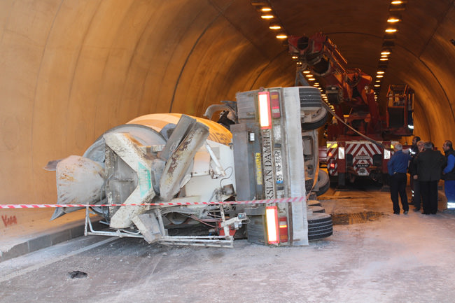 Öte yandan tünel girişinde devrilen mikser, vinç yardımıyla kaldırıldı. Yapılan çalışmaların ardından, tünel tekrar trafiğe açıldı.