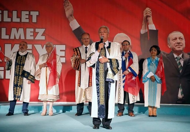 FETÖ silahlı terör örgütü ve dış bağlantıları tarafından milletin iradesini hiçe sayarak, demokrasimize ve milli iradeye yapılmaya çalışılan bu darbe girişiminin amacı Türkiye'yi çatışma ortamına sürüklemek, devletimizin ve milletimizin birliğini ve bütünlüğünü bozmaktır. Türkiye Cumhuriyeti'nin varlığına, bütünlüğüne ve birliğine kasteden, kendi karşısında, halkına silah sıkacak kadar gözü dönmüş, fitne, zulüm ve kanla beslenen bu zihniyetin karşısında başta 'Başkomutan' sıfatıyla Cumhurbaşkanımız olmak üzere, hükümetimiz, güvenlik güçlerimiz ve milletimizin dik ve onurlu duruşu ve fedakar çabaları ile bu darbe kalkışması bastırılmış ve bir demokrasi zaferi kazanılmıştır. İzmir üniversitelerini temsil eden altı üniversite olarak demokrasimizi, milli birlik ve bütünlüğümüzü hedef alan bu tip kalkışmalara karşı her zaman devletimizin, hükümetimizin ve milletimizin yanındayız" dedi.