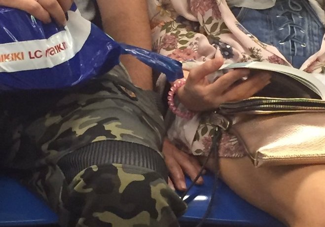 Twitter'da bir kullanıcı, hemen karşısında oturan erkeğin yanındaki kadını uyuyor gibi yapıp eliyle taciz ettiğini belirterek, o anların fotoğraflarını paylaştı. Erkeği daha sonra uyardığını ve erkeğin yanıt olarak uykulu olduğunu söylediğini yazan tanık kadın, erkeğin kendisini fotoğrafları silmesi için takip ettiğini ve çevredekilerin yardımıyla uzaklaşabildiğini söyledi.