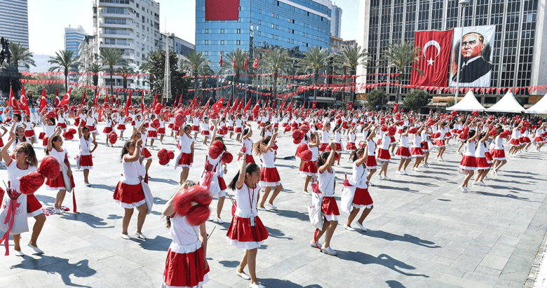 İzmir'deki törende 30 ortaokuldan bin 300 öğrenci renkli gösteriler sundu. Cumhuriyet Meydanı'ndaki törende, Atatürk anıtına çelenk konulmasının ardından, saygı duruşunda bulunuldu, İstiklal Marşı okundu. Törenleri izlemeye gelenleri "Ölürüm Türkiye'" şarkısı ve ellerinde Türk bayraklarıyla karşılayan öğrenciler, İzmir Valisi Erol Ayyıldız, Ege Ordusu ve Garnizon Komutanı Orgeneral Abdullah Recep ve İzmir Büyükşehir Belediye Başkanı Aziz Kocaoğlu'na çiçek verdi.