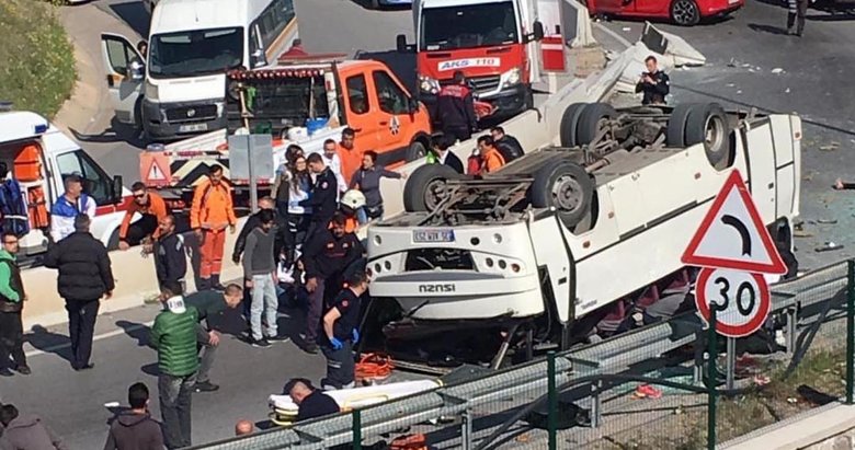 İzmir'de dün sabah saatlerinde Z.Y. idaresindeki 35 AEM 253 plakalı okul servis minibüsü, Bayraklı'dan down sendromlu ve zihinsel engelli öğrencileri alarak Karşıyaka Meslek Eğitim Merkezi'ne gitmek üzere hareket etti. İçinde öğrenciler ile yakınlarından oluşan 34 kişinin bulunduğu servis aracı, Karşıyaka yönüne giderken, Bayraklı'daki şehir hastanesi inşaatının bulunduğu yan yolda, iddiaya göre freni boşalınca takla attı. Beton bariyerleri devirerek karşı şeride geçen ve Önder Acılar'ın kullandığı 35 KF 8463 plakalı otomobile çarpan minibüs ters döndü.