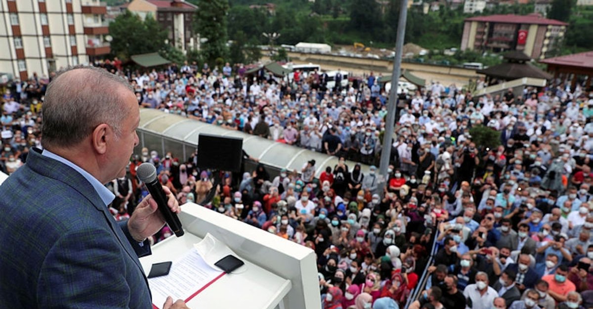 Erdoğan daha sonra Güneysu'da cuma namazını kıldı. Namaz sonrasında ise vatandaşların dertlerini dinledi. Vatandaşlarla bir süre sohbet eden Başkan Erdoğan bu sırada kurmaylarına not da aldırmayı ihmal etmedi. Daha sonra da ilçede otobüsün üzerinden vatandaşlara hitap eden Erdoğan, yamaçlardaki yapılaşma konusunda uyardı, "Ne olur 5 kat, 10 kat ev yapmayın" dedi. Erdoğan, devletin çalışmalarına destek isterken, 550 konutun da 1 yılda tamamlanacağını ifade etti. Başkan Erdoğan, özetle şunları söyledi: