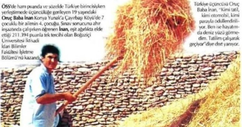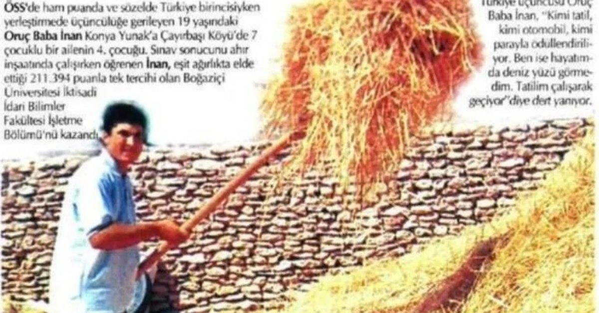 Bunun ardından gazete manşetlerine "Haberi harman yaparken aldı', 'Köylü Şampiyon', 'ÖSS Şampiyonu tarladan çıktı', 'Köyün damgasını ÖSS'ye vurdum', 'Harman College" başlıklarıyla geçti. Konya Akşehir doğumlu İnan, 500 nüfuslu köyünden üniversiteyi kazanana dek çıkmamıştı. Türkiye'ye adını duyuran Oruç Baba İnan, Boğaziçi Üniversitesi İşletme Bölümü'nü dereceyle tamamladı. Üniversite eğitiminin ardından birçok üst düzey görevde bulundu.