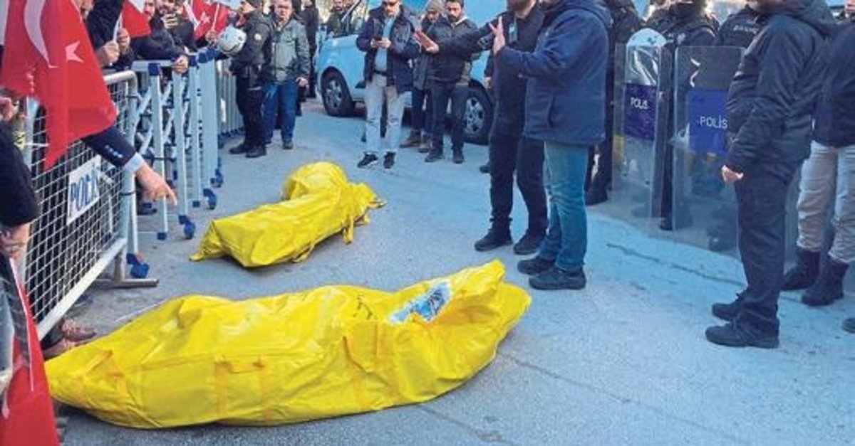 ANKARA'DA şehit ve gazi yakınları DEM Parti önünde eylem yaptı. Terörü kınayan tezahüratların yapıldığı eylemde, DEM Parti'nin, PKK ile ilişkisine vurgu yapıldı. Türkiye Gaziler ve Şehit Aileleri Vakfı Başkanı Lokman Aylar, geçtiğimiz günlerde Kuzey Irak'ta şehit düşen 12 kişinin kanında DEM Parti'nin olduğunu söyledi. Aylar, "Terör sevicisi Batı'nın çocukları hem bu millete hem bu vatana ihanet ediyor, aziz şehitlerimizin kemiklerini sızlatmaya devam ediyor" diye konuştu. Şehit ve gazi yakınları protesto gösterisinde "Selahattin Demirtaş teröristtir", "Vatana kurşun sıkanın sonu sarı torba" yazılı pankartlar açılarak, parti binasının önüne terörist cesetlerinin konulduğu sarı torbalar bırakıldı.