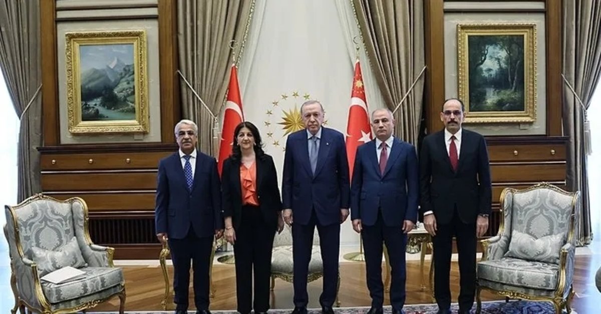 Terörsüz Türkiye yolunda Cumhurbaşkanı Recep Tayyip Erdoğan, dün DEM Parti heyetini kabul etti. Görüşmede DEM Parti adına Pervin Buldan ve Mithat Sancar yer aldı. Yine MİT Başkanı İbrahim Kalın ve AK Parti Genel Başkanvekili Efkan Ala da toplantıda hazır bulundu.