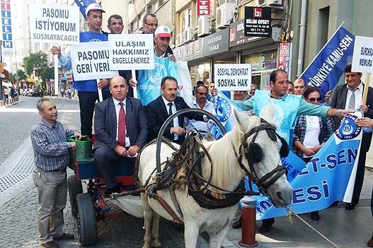 Türk Yerel Hizmet Sen İzmir Şubesi üyeleri, ulaşım haklarından yararlanamadıklarını belirterek at arabasıyla protesto eylemi gerçekleştirdi. İzmir Büyükşehir Belediyesi önünde toplanan grup, at arabasına binerek İzmir Büyükşehir Belediyesi tarafından belediye memurlarına ulaşımda uygulanan ücret politikasını protesto etti.
