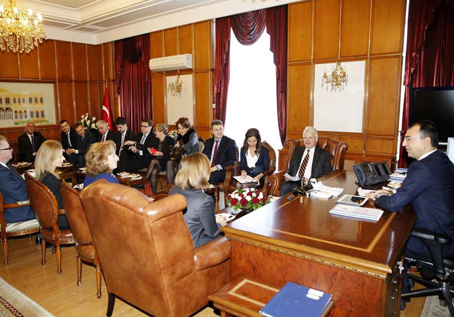 İzmir Valiliği Avrupa Birliği Ankara Delegasyonu Başkanı Büyükelçi Hansjörg başkanlığında Avrupa Birliği Büyükelçilerinden oluşan 22 kişilik heyet, İzmir Valisi Mustafa Toprak'ı makamında ziyaret etti. Ziyarette İzmir'de yaşayan Suriyeliler hakkında geniş bir tarama yaptırdığını söyleyen Vali Toprak, "Kentte yaşayan 35 bin çocuk Suriyelinin 24 bin 271'i eğitim çağında. Geçici olarak burada kalsalar da bu insanların eğitim ihtiyaçlarını karşılamak için altyapı geliştirmeye çalışıyoruz" diye konuştu.