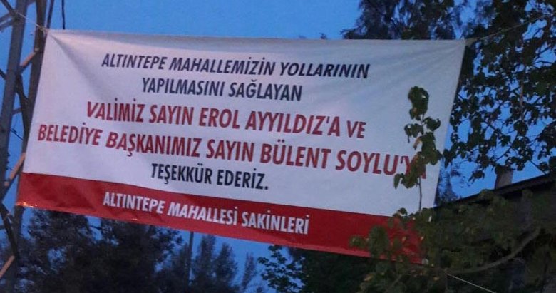 İzmir'e yakışmıyorİzmir Büyükşehir Belediye Başkanı Aziz Kocaoğlu geçen yıl kar yağışından seraları büyük hasar gören Altıntepe Mahallesi'nin yollarını asfaltlama sözü vermişti ancak bugüne kadar herhangi bir adım atılmadı. Menderes Belediye Başkanı Bülent Soylu'nun çabalarıyla yapılan altyapılardan sonra Altıntepeliler bir teşekkür pankartı astı.