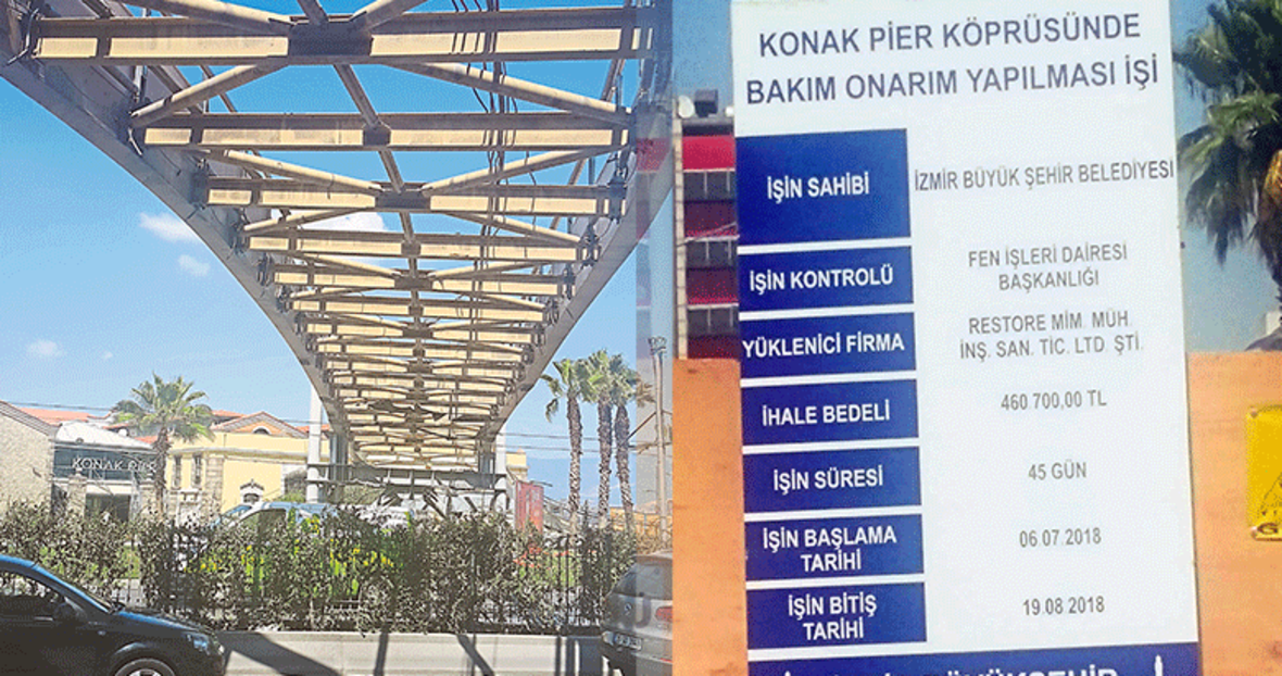 Büyükşehir, 6 Temmuz'da bakım onarıma alıp yaya ulaşımına kapattığı Konak Pier Alış Veriş Merkezi önündeki yaya köprüsünü öngörülen 45 günlük süre içinde tamamlayamayınca yüklenici firmaya neredeyse işin toplam süresi kadar süre uzatımı verdi.