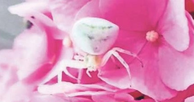 İZMİR'İN Kiraz ilçesinde yaşayan ev hanımı İlgi Keleş, evinin bahçesinde halk arasında "İnsan yüzlü örümcek" olarak bilinen "Thomisus Onustus" örümceğine rastladı.