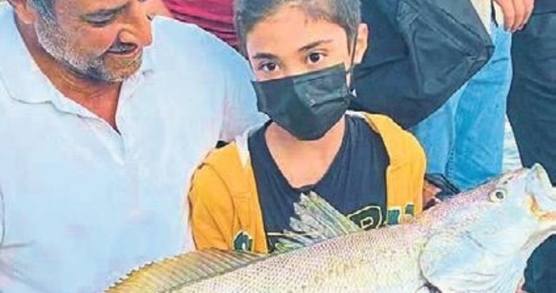 İZMİR Karşıyaka ilçesinde olta atan balıkçılardan biri 'kaya levreği' olarak bilinen Granyöz balığı tuttu. Kepçe ile kıyıya çıkarılan 10 kiloluk balık görenleri şaşkına çevirdi. Dev balığı görüntülemek için cep telefonlarına sarılan onlarca vatandaş, maske ve mesafe kuralını unuttu.