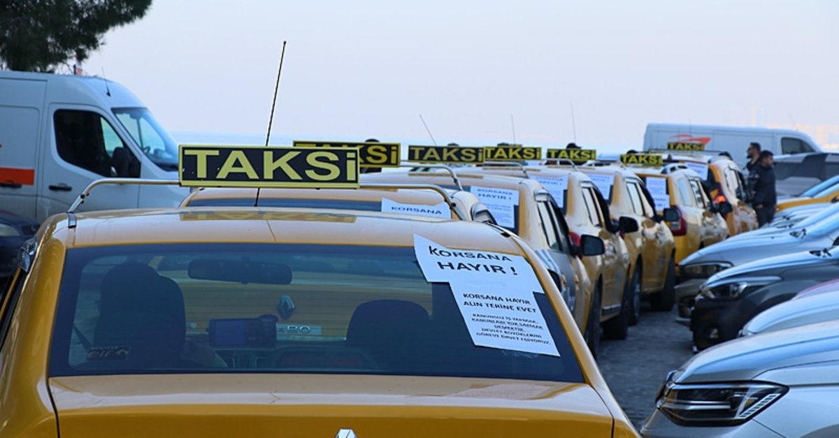 Konak ilçesindeki Alsancak Gar önünde toplanan yaklaşık 50 taksi şoförü, araçlarına "Korsana hayır", "Emek hırsızlığına hayır" yazılı afiş astı.