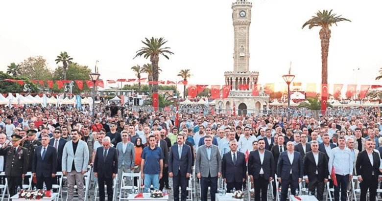 İzmirlilerin tek yürek olduğu etkinliğe İzmir Valisi Süleyman Elban, Ege Ordusu Komutanı Orgeneral İrfan Özsert, İzmir Cumhuriyet Başsavcısı Ali Yeldan, Sahil Güvenlik Ege Deniz Bölge Komutanı Tuğamiral Tayfun Paşaoğlu, AK Parti Genel Sekreteri ve İzmir Milletvekili Eyyüp Kadir İnan, AK Parti İzmir İl Başkanı Bilal Saygılı, MHP İzmir İl Başkanı Veysel Şahin ile AK Parti ve MHP milletvekilleri katıldı. Vali Süleyman Elban yaptığı konuşmada, 15 Temmuz gecesinin dünyaya bir ders olduğunu belirterek, "Bu millete kimse tuzak kuramaz. Artık bu millete kimse hainlik edemez. Biz de her yıl bu meydanlara toplanıyoruz.