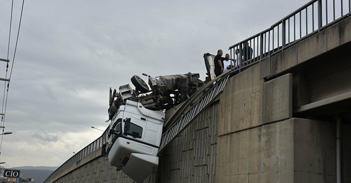 Kontrolden çıkan TIR yan yatarken, aracın kupa kısmı 12 metre yükseklikteki viyadükte asılı kaldı. İtfaiye ekiplerince kurtarılan Öngen hastaneye kaldırılırken, olayda can kaybı olmaması sevindirdi.