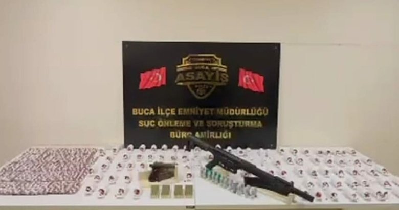 Son dakika İzmir haberleri..Buca İlçe Emniyet Müdürlüğü ekipleri ekiplerinin uyuşturucu madde ticareti ve ruhsatsız silah bulundurma, taşıma veya satın alma suçlarına yönelik yaptığı çalışmada yakalanan V.B.'nin İnönü Mahallesi'ndeki evinde arama yapıldı.