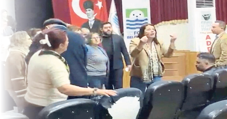 FOÇA'DA Atatürkçü Düşünce Derneği seçimlerinde kavga çıktı. Konuşmak isteyen bir kişi salondan atılırken, CHP'li Belediye Başkanı Saniye Bora Fıçı, öfkesini kontrol edemedi. Reha Midilli Kültür Merkezi'nde yapılan seçimler, gergin bir tartışmayla başladı. İlçede yaşayan sunucu Hakan Doğanay, derneğin eski yöneticilerini ve belediye yönetimini eleştirmek isteyince salondan çıkarıldı. Duruma sert tepki gösteren Fıçı, Doğanay'ın ardından "Pislikler!" diye bağırdı. Fıçı, yaşananlardan sorumlu tuttuğu dernek yöneticilerine de "Müsaade etmeyeceksiniz. Biz ne konuştuk!" diye çıkıştı. Olay, salonu dolduran üyeler arasında şaşkınlık yaratırken, seçim süreci kısa bir duraksamanın ardından devam etti.