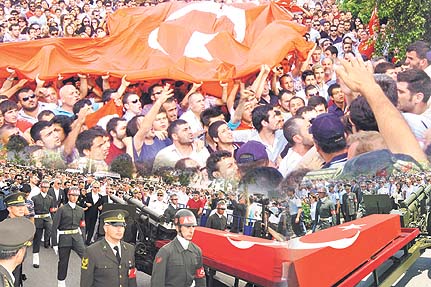 tarafından taşınması gerektiği konusunda babayı ikna etti. Bu sırada Türk bayrağı açan bazı vatandaşlar terör örgütü aleyhinde slogan attı. Devlet Bakanı Mehmet Aydın tören sonunda şehidin ailesine sarılarak baş sağlığı diledi.