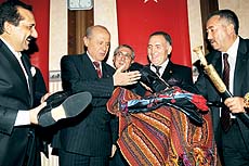 MHP Genel Başkanı Devlet Bahçeli'nin katılımı ile Denizli'de düzenlen MHP İl Başkanları Toplantısı'na damgayı körüklü çizme vurdu. Kendisine efe kıyafeti ile birlikte hediye edilen körüklü çizmenin orijinal olup olmadığını belirlemeye çalışan Bahçeli, ilginç bir görüntü sergiledi. Körükleri tek tek sayan Bahçeli'nin 7 sayısını bulduktan sonra çizmenin orjinal olduğunu söylemesi MHP'lileri şaşırttı.