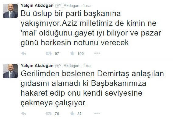 Başbakan Yardımcısı Yalçın Akdoğan, "Gerilimden beslenen Demirtaş, anlaşılan gıdasını alamadı ki Başbakanımıza hakaret edip onu kendi seviyesine çekmeye çalışıyor" değerlendirmesinde bulundu. Akdoğan, sosyal paylaşım sitesi Twitter hesabı üzerinden yaptığı açıklamada, HDP Eş Genel Başkanı Selahattin Demirtaş'ın, Başbakan Ahmet Davutoğlu'na yönelik üslubunun bir parti başkanına yakışmadığını belirtti.