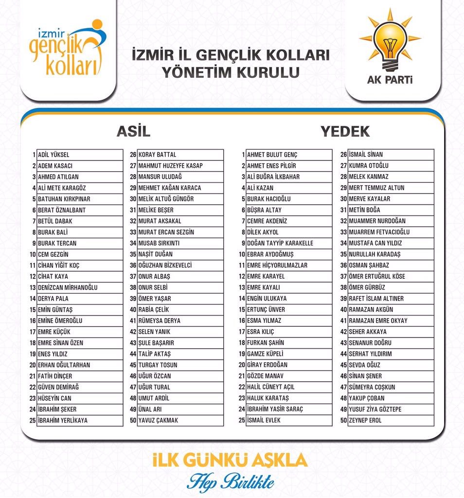 AK Parti İzmir İl Gençlik Kolları Başkanlığına geçtiğimiz günlerde Adil Yüksel'in getirilmesinin ardından Yeni İl Gençlik Kolları Yönetim Kurulu Üyeleri de belli oldu. İşte liste