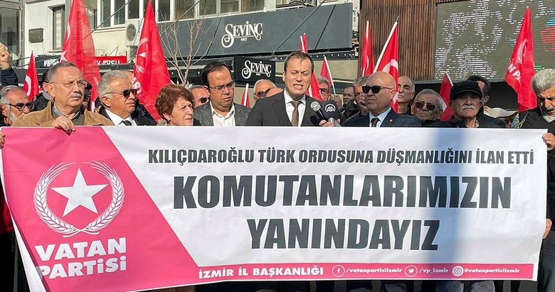 ELLERİNDEKİ ay yıldızlı Türk Bayraklarıyla İzmir Alsancak Kıbrıs Şehitleri Caddesi'nde buluşan Vatan Partililer, CHP Genel Başkanı Kemal Kılıçdaroğlu'nun meclis kürsüsünden Türk Ordusu ve Türk Komutanlarına yönelik düşmanca hareketlerine tepki gösterdi. Basın açıklaması yapan Vatan Partisi İzmir İl Başkanı Çağdaş Cengiz, "Kılıçdaroğlu'nun hedef aldıkları komutanlar, 15 Temmuz'da, Fırat Kalkanında, Zeytin Dalı Harekatlarında en önde botlarını giyip savaşmışlardır. PKK'yı hendeklere gömmüşlerdir. İkinci İsrail planını bozmuşlardır. Mavi Vatan'da kahramanca bayrak açmışlardır. Kemal Kılıçdaroğlu'nun bu açıklamaları Türk Ordusuna karşı savaş açmaktır. Türk Ordusunun komutanlarına hakaret edenler eninde sonunda kaybedeceklerdir" diye konuştu.