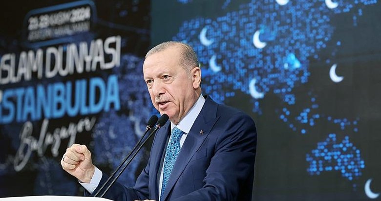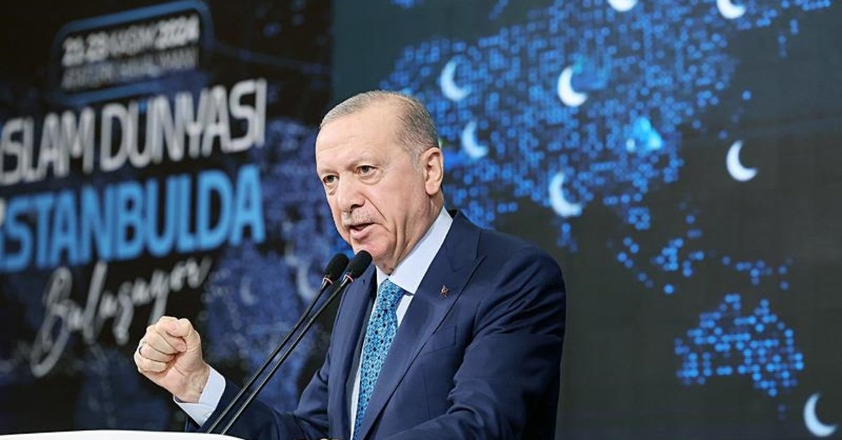 İnsanlığın kan kaybettiği bir dönemden geçtiğini vurgulayan Erdoğan, "Uluslararası sistemin imtiyazlı aktörleri kendi çıkarları uğruna İslam coğrafyası başta olmak üzere dünyanın farklı bölgelerini savaş, çatışma ve istikrarsızlık girdabına sürüklüyor. Dünya biraz da İslam alemini zorlu bir sınavdan, kapsamlı bir kuşatmadan, sinsice hazırlanmış planların ateş çemberinden geçiriyor. Bakınız, hemen yanı başımızdaki Filistin'de 14 aydır mazlumlar, masumlar, çocuklar, kadınlar, yaşlılar ve sivil acımasızca katlediliyor. Küresel yönetişim mekanizmaları, uluslararası örgütler ve uluslararası medya Filistin'de, Lübnan'da ve daha pek çok bölgede işlenen insanlık suçlarını görmezden geliyor" dedi.