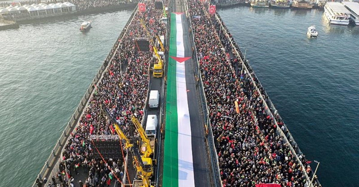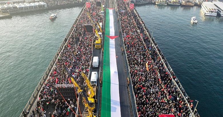 Milli İrade Platformu tarafından düzenlenen "Dünyayı Uyandırıyoruz", "Dün Ayasofya, Bugün Emevi, Yarın Aksa" ve "Bir Güneş Doğuyor" sloganlarıyla yeni yılın ilk sabahında Galata Köprüsü'nde düzenlenen Filistin'e destek yürüyüşüne binlerce vatandaş katıldı. Ayasofya-i Kebir Camii Şerifi'nde kılınan sabah namazının ardından oluşan insan seli Galata Köprüsü'ne akın etti.