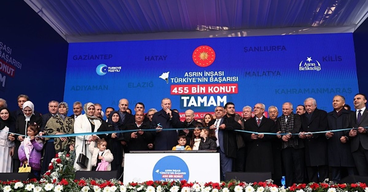 Kahramanmaraş merkezli depremlerin vurduğu Hatay'da, ciddi yıkımın yaşandığı Atatürk Caddesi'nde '455 Bininci Afet Konutu Kura Çekimi, Anahtar Teslimi ve Yapımı Tamamlanan Yatırımların Toplu Açılış Töreni' düzenlendi. Törene; Başkan Recep Tayyip Erdoğan'ın yanı sıra MHP Genel Başkanı Devlet Bahçeli ve bakanlar katıldı.