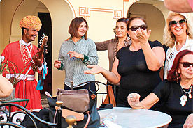 Sabah kahvaltısını ve akşam yemeklerini hep kaldığımız otellerde almak üzere program yapıldığı için ve zaman kısıtlı olduğu için ancak öğlenleri kahve molası verebiliyorduk. Bütün bu Jaipur kent programını bir güne sığdırdığımız için yorgunluktan tabanlarımız şişti. Neyse ki Sarayın ortasında Palace Cafe'de verdiğimiz molada kırmızı entarili erkek bir müzisyen-çalgıcı (köçek tarzında) kahvelerimizi yudumlarken bizi bir nebze dinlendirdi. Çok neşeli etnik müzik ve elinde çok ilkel bir enstrümanla hem de sonunda ödüllendirileceği düşüncesiyle kadın erkek herkese cilveler yaparak. Jaipur'un başka zengin miraslarına muhteşem saraylarda rastlamak mümkün. Bizim vaktimiz olmadığı için gezemedik. İlk günün akşam üzeri Jaipur çarşısında dağıldık 1 saatimiz vardı o sırada adeta törene dönüşen pazarlıklarla yerel "pijamalar" ve uğur boncukları aldık. Hem de ilk söylenen fiyatların yüzde 30 altına.