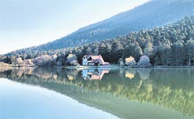 Ufacık bir esinti yok havada, gökyüzünde ise tek bir bulut... "Tabak gibi" denir ya göl yüzeyi öyle, durgun, berrak, pürüzsüz. Hangi kıyısından bakarsınız, karşı sahilin yansıması bütün ayrıntılarıyla suda... Bu güzelliğe sonbahar sarılarını, ahşap iskeleleri, yürüme yollarını, ahşap binaları da eklerseniz eğer, fotoğraf karelerine girebilecek öyle özgün, öyle renkli, öyle benzersiz ayrıntılar var ki...