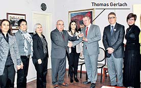 İzmir'deki görevine yeni başlayan Almanya Başkonsolosu Thomas Gerlach, ayağının tozuyla ilk ziyaretini, KİT-VAK'a (Kemik İliği Transplantasyon Vakfı) yaptı. Geçtiğimiz ay TAKEV Okulları tarafından düzenlenen ve 23 bin 850 TL lik gelir elde edilen yeni yıl kermesinin gelirini teslim etmek üzere TAKEV Okulları Genel Müdürü Gönül Ketenci ve Okul Aile Birliği Üyeleri ile vakfı ziyaret eden Konsolos Gerlach, Vakıf Başkanı Ramazan Soncul'dan vakıf çalışmaları ile ilgili detaylı bilgi aldı. Onkoloji hastaları ve hasta yakınları ile ilgili vakfın yapmış olduğu çalışmalardan ve yürüttüğü konuk evi projesinden etkilenen Gerlach, İzmir'de görev yaptığı süre boyunca özellikle sağlıkla ilgili çalışmalar yapan vakıf ve sivil toplum örgütlerine konsolosluk olarak destek vereceklerini belirterek, "Türkiye'deki ilk resmi ziyaretimin, ilk buluşmamın KİT-VAK gibi sağlık konusunda özveriyle ve büyük bir gönüllülük esasıyla çalışma yürüten sizlerle yapmış olmak benim için çok anlamlı. Sadece burada değil Almanya'da da sağlık konusunda çalışma yürüten kuruluşlarla bağlantı kurmanıza ve projelerinize uluslararası platformda da destek vermek isterim" diye konuştu. Konsolos Gerlach ile birlikte 23 bin 850 tl lik çeki vakıf yöneticilerine teslim eden TAKEV Okulları Genel Müdürü Gönül Ketenci, "Vakfa böylesi büyük bir destek sağlamış olmaktan büyük mutluluk duyuyoruz. İzmir'deki en büyük sosyal sorumluluk projelerinden biri olan kermesimizin gizli kahramanları olan okul aile birliği üyelerimize organizasyon için gösterdikleri çaba nedeniyle teşekkür ederim" dedi.