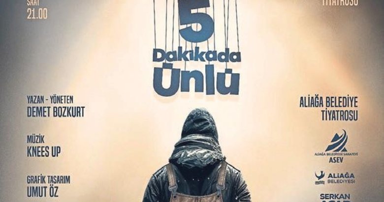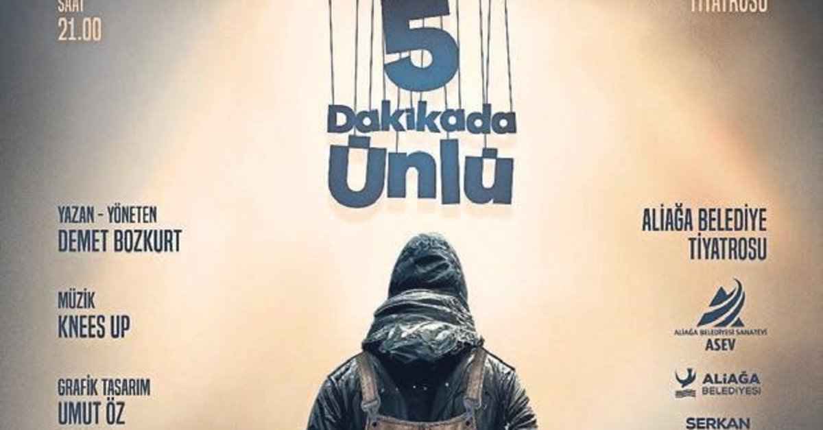 İZMİR Aliağa Belediyesi Sanatevi yıl sonu etkinlikleri kapsamında ücretsiz olarak sahnelenecek '5 Dakikada Ünlü' oyunu, izleyenlere tiyatro resitali sunacak. 28 Mayıs 2024 Salı günü Ulaş Bayam Açıkhava Tiyatrosu'nda saat 21.00'de başlayacak oyunda 40 kişilik ALBET ekibi sahne alacak. Oyunun müziklerini Kness Up grubu üstleniyor. Oyunda; günümüzde ünlü olma kavramının nasıl değiştiğini, görünür olmanın düşünür olmaktan artık daha kıymetli olduğunu ve sürekli kimlik arayışının olduğu bir yüzyılda, insanların sanal bir dünyaya daha fazla itelenerek başkalarının kuklası haline geldiği bizlere absürt bir dille anlatıyor. Oyun bir yandan kahkaha tufanı yaşatırken bir yandan da düşündürecek.