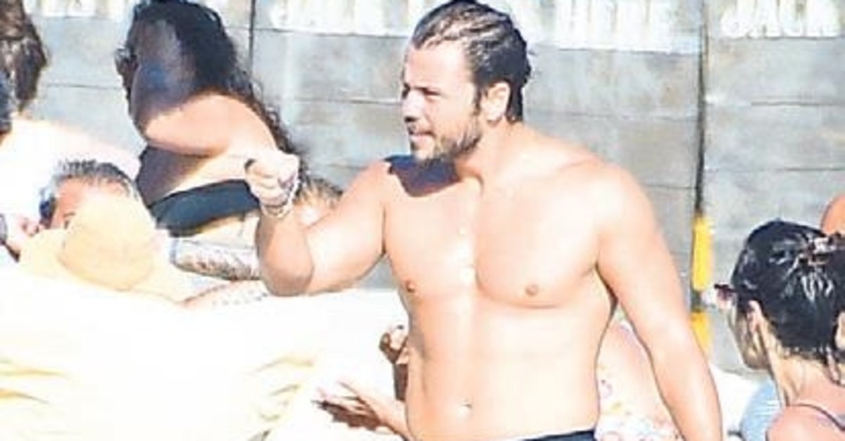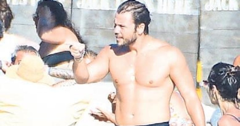 Kimi zaman eşiyle birlikte suya giren yakışıklı oyuncu Sarıtaş, kimi zaman da yakın arkadaşlarına vakit ayırarak yüzerken sohbet etti. Denize girerken temkinli davranan Tolga Sarıtaş, terliklerini de ayağından çıkarmadan yüzdü.